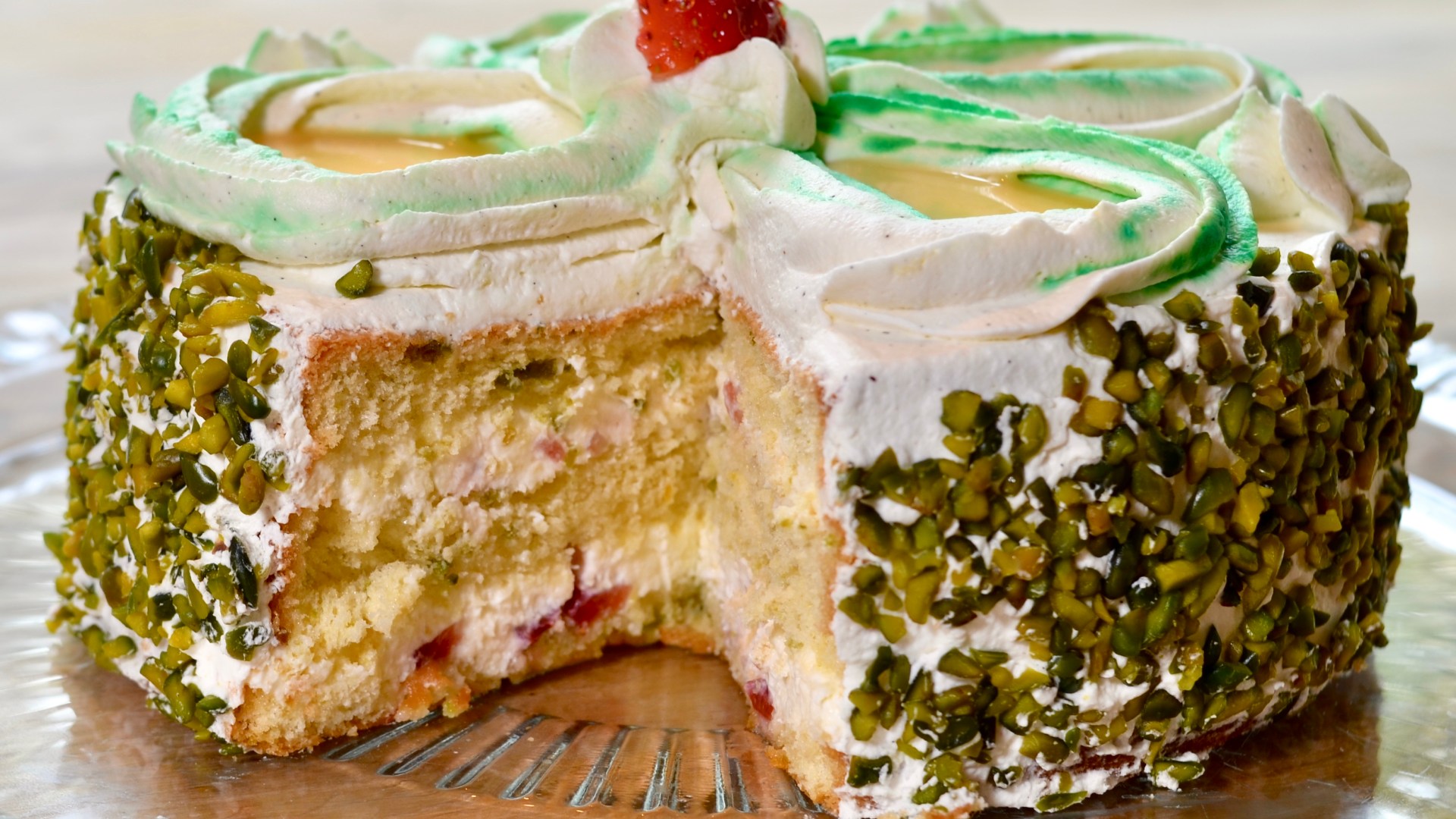 Den Rand der Torte dann noch mit gehackten Pistazien verzieren.