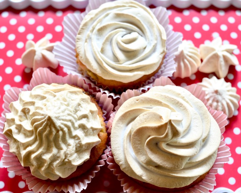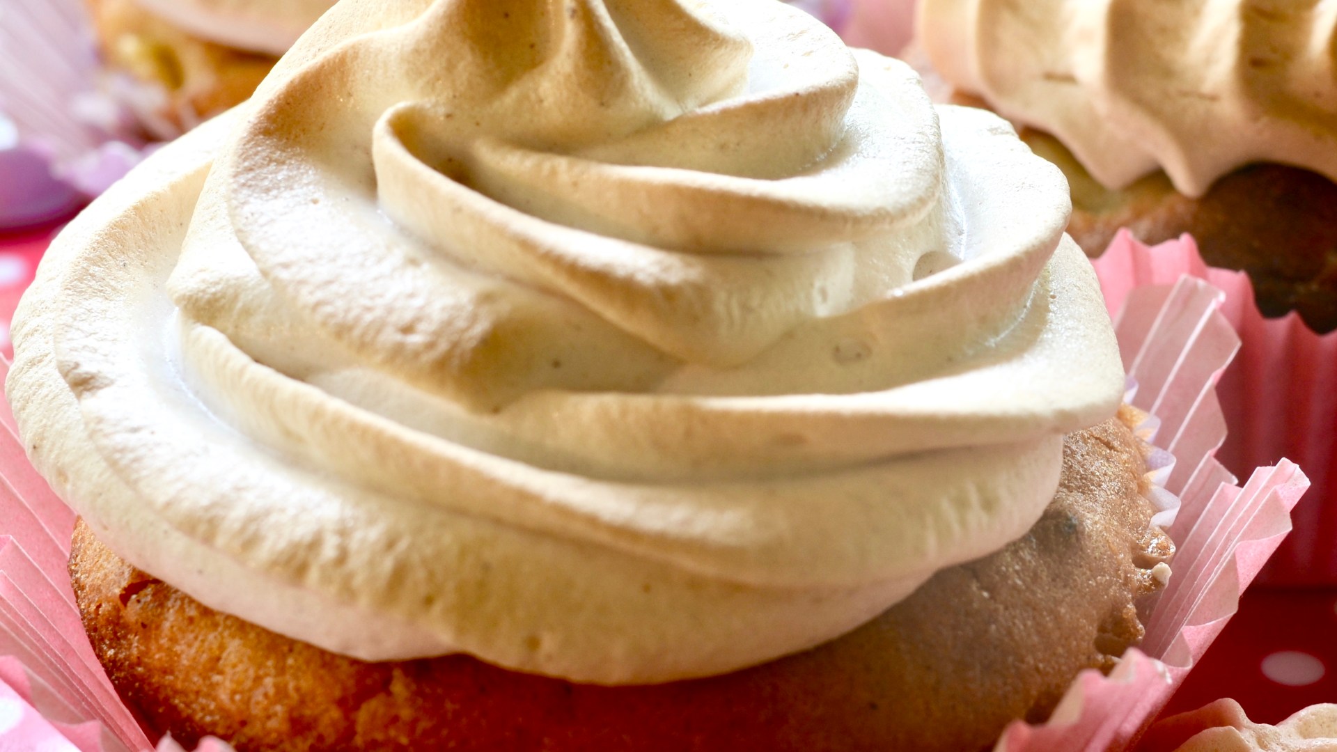 Gebt die Masse in einen Spritzbeutel und spritzt mit eurer Lieblingstülle das Baiser auf die Muffins.