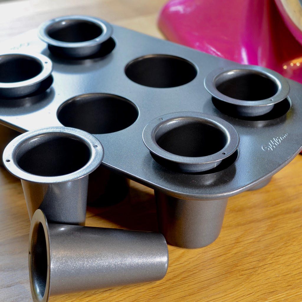 Auf 6 gleichmässige Teile aufteilen und zu Kugeln formen, in eine Becher Back Form geben und durch hineindrücken des „Stempels“ die Becher herstellen. Für 30 Min. kaltstellen und dann im vorgeheizten Ofen bei 180°C auf dem unteren Blech backen.