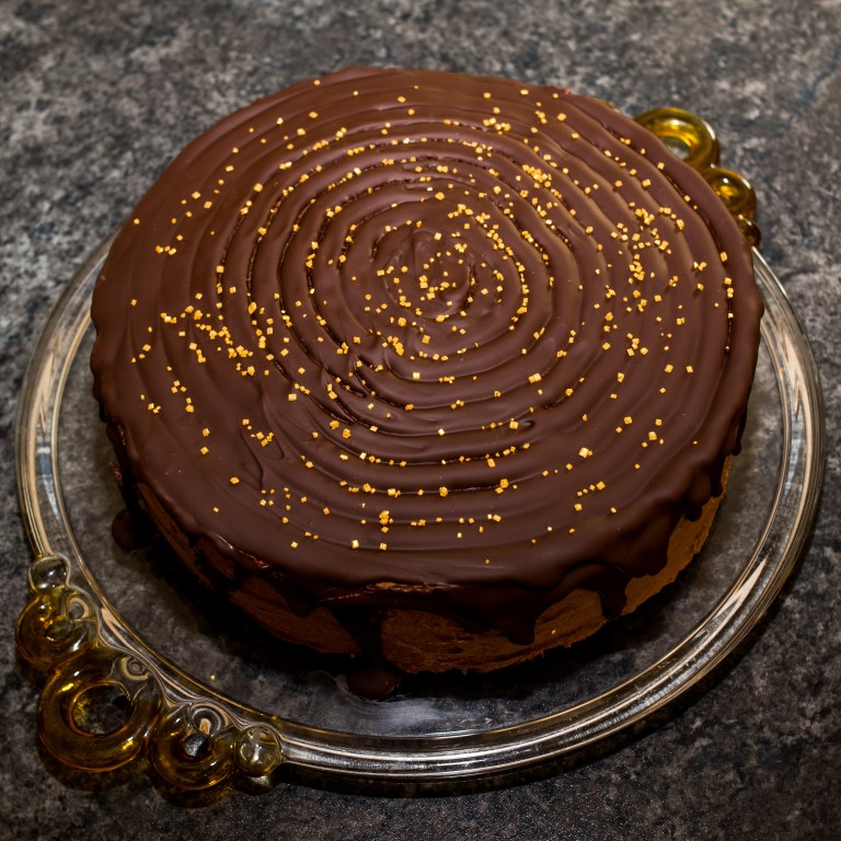 Die Kuvertüre im Wasserbad schmelzen, etwas abkühlen lassen und mittig auf den oberen Boden giessen. Mit einer Palette auf der ganzen Torte verteilen, ihr könnt auch gerne Paletten mit Mustern benutzen.