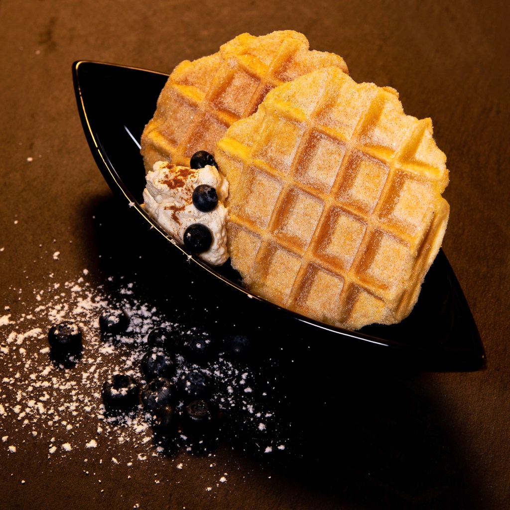 Dann einen Esslöffel Teig in ein Waffeleisen mittig geben , das es kleine runde Waffeln gibt.
